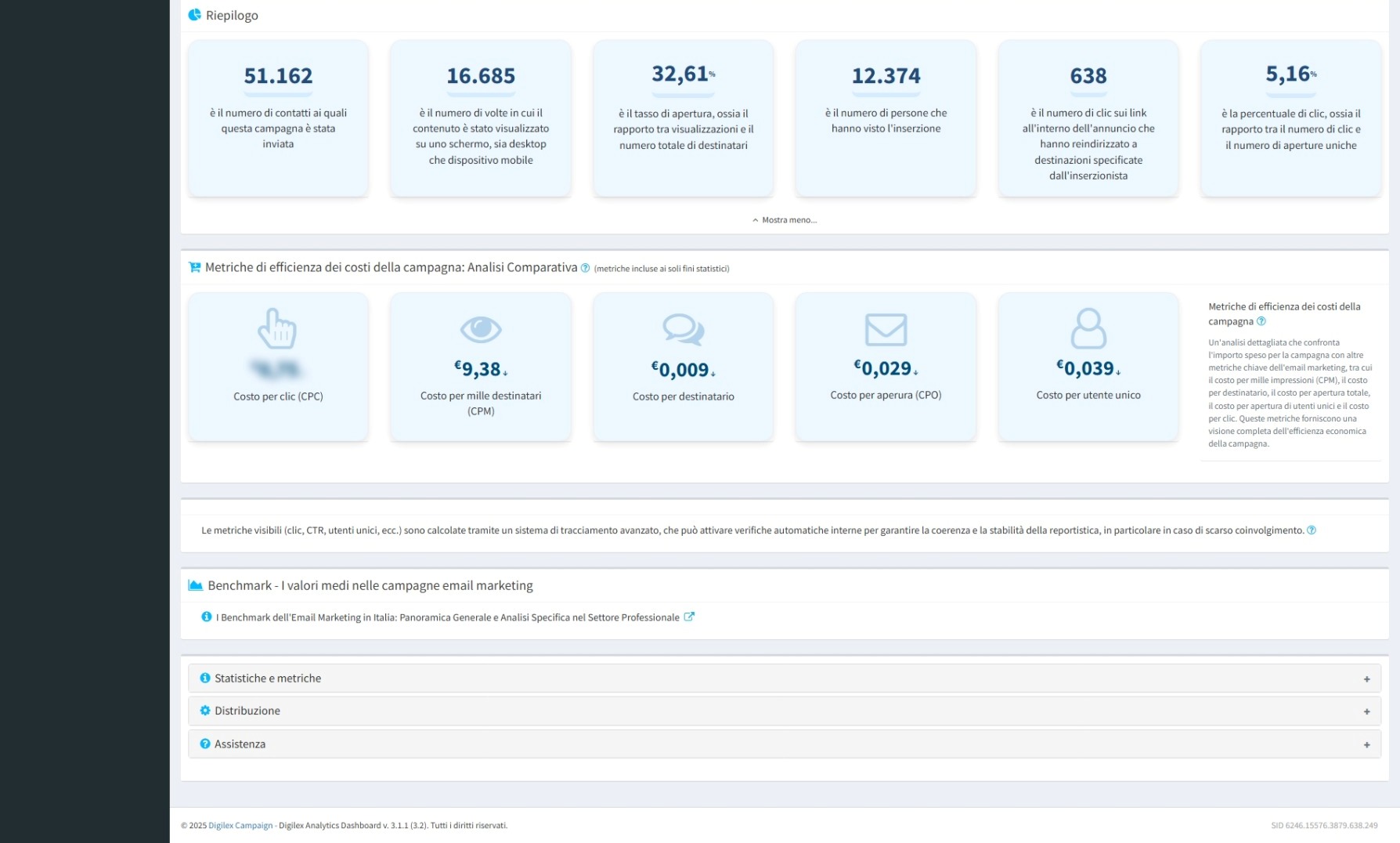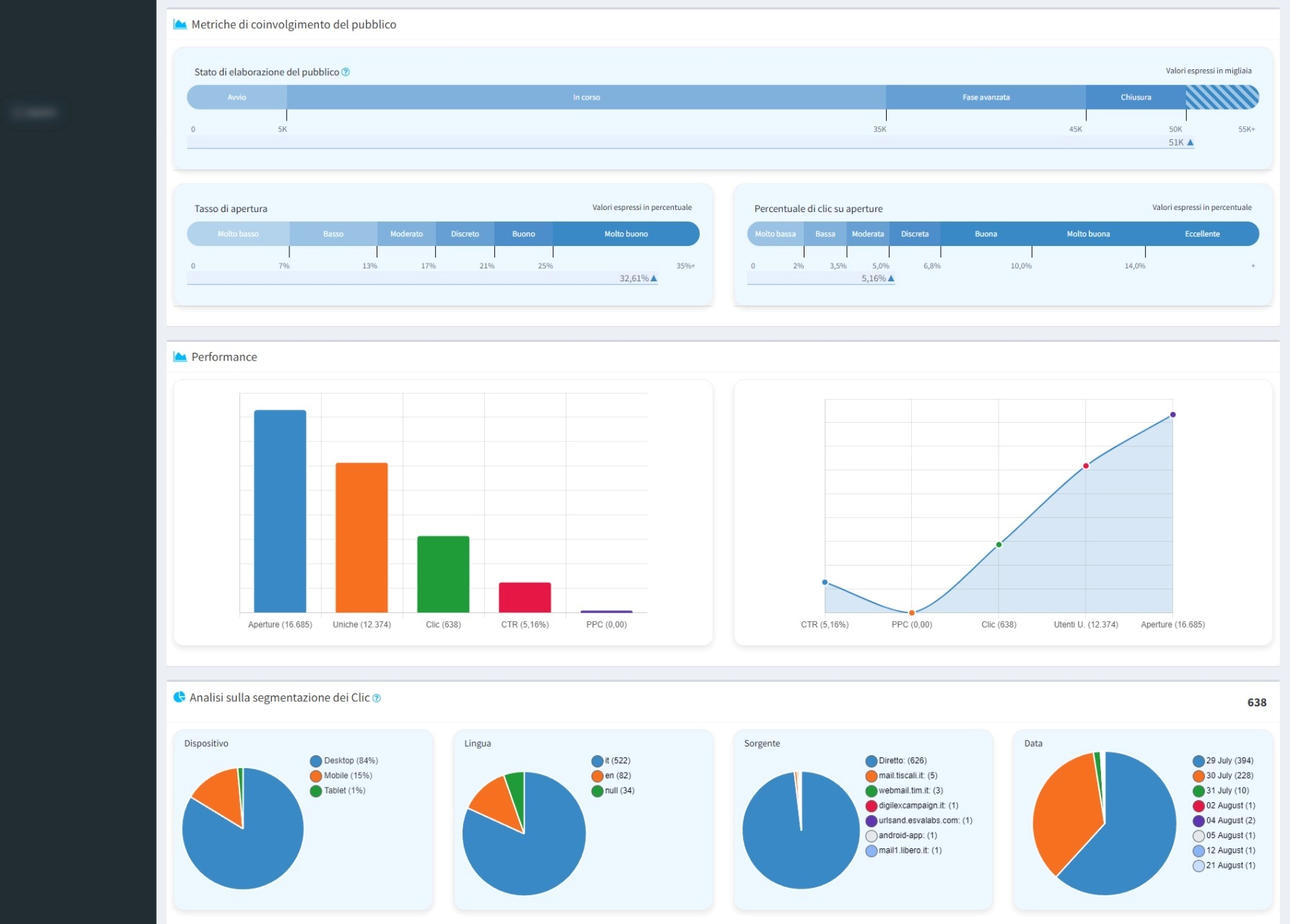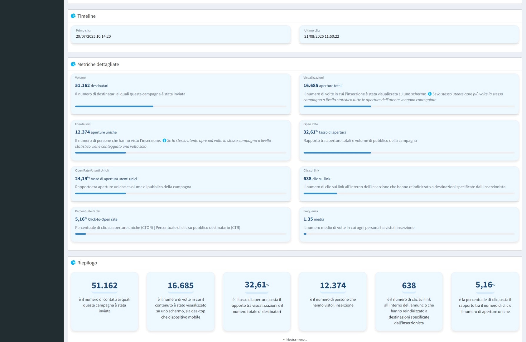 Statistiche disponibili solo al termine della campagna. I dati di performance, inclusi tassi di apertura e di clic, vengono forniti solo dopo la conclusione dell’invio e non in tempo reale.